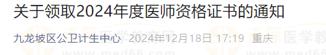 重慶九龍坡區(qū)2024年公衛(wèi)醫(yī)師證書12月20日開始發(fā)放