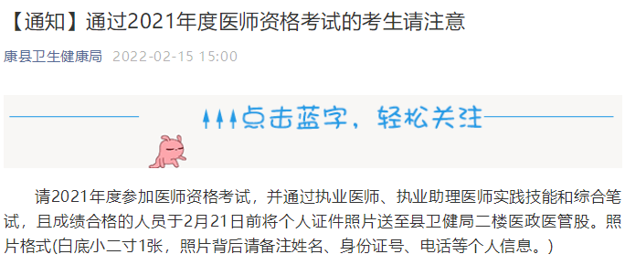 請(qǐng)2021年度參加醫(yī)師資格考試,并通過執(zhí)業(yè)醫(yī)師、執(zhí)業(yè)助理醫(yī)師實(shí)踐技能和綜合筆試,且成績(jī)合格的人員于2月21日前將個(gè)人證件照片送至縣衛(wèi)健局二樓醫(yī)政醫(yī)管股。照片格式(白底小二寸1張,照片背后請(qǐng)備注姓名、身份證號(hào)、電話等個(gè)人信息。)