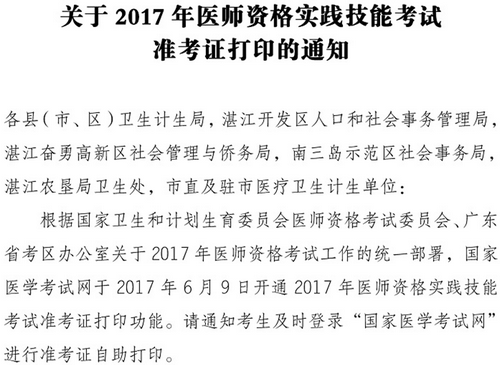 2017年廣東湛江醫(yī)師資格實(shí)踐技能準(zhǔn)考證打印時(shí)間