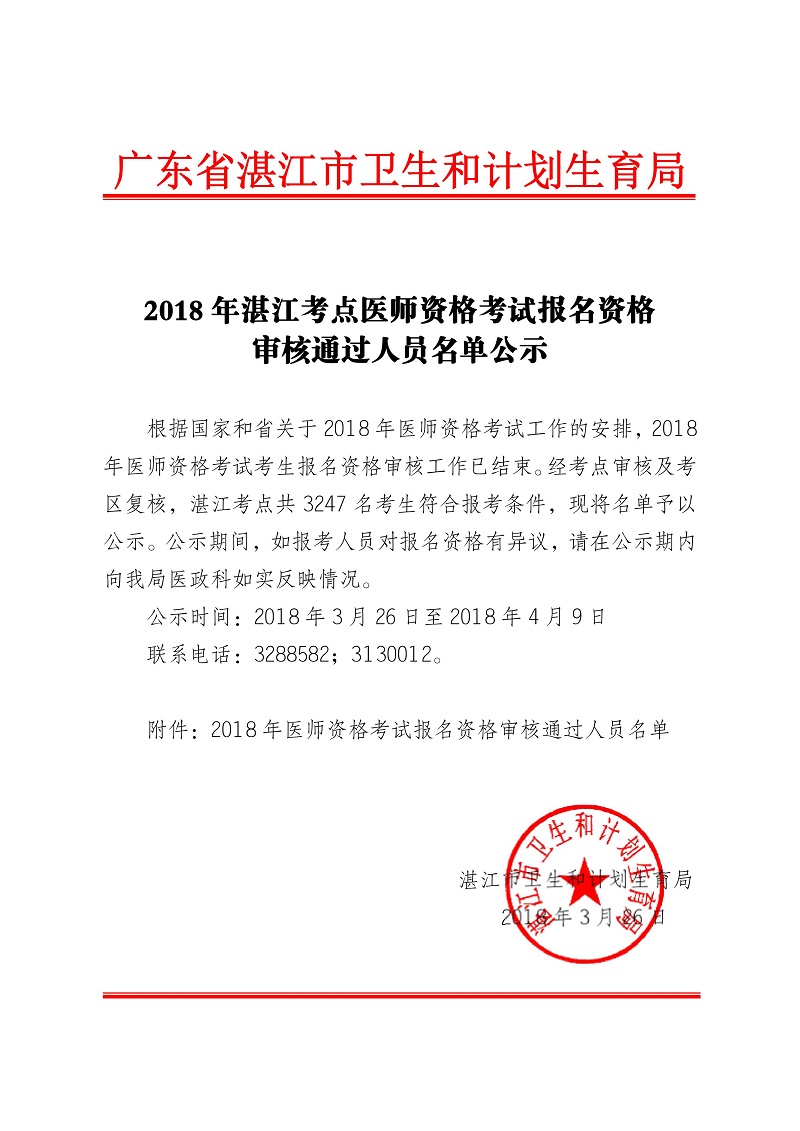 2018廣東省湛江考點醫(yī)師資格考試報名資格審核通過人員名單公示
