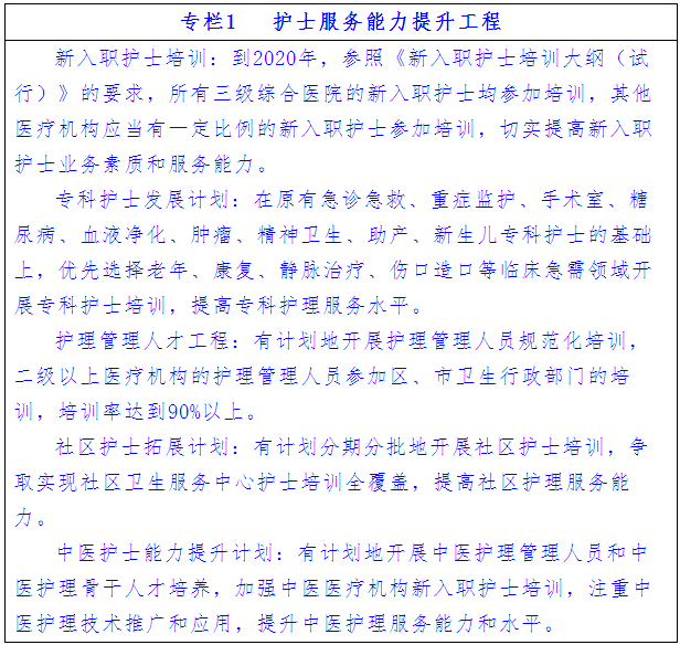 “十三五”期間,重點開展新入職護(hù)士、??谱o(hù)士、護(hù)理管理人員、社區(qū)護(hù)士、助產(chǎn)士等人員培訓(xùn),切實提高護(hù)理服務(wù)能力和管理水平。