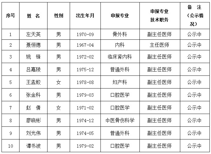 經(jīng)審核,擬推薦左天英等10名同志參加2017年度民營(yíng)醫(yī)療機(jī)構(gòu)衛(wèi)生專業(yè)技術(shù)高級(jí)職務(wù)任職資格“專項(xiàng)評(píng)審”,現(xiàn)予公示。