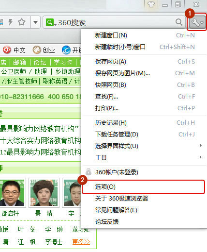 打開360極速瀏覽器-點(diǎn)擊右上角扳手-選項(xiàng),如圖所示: