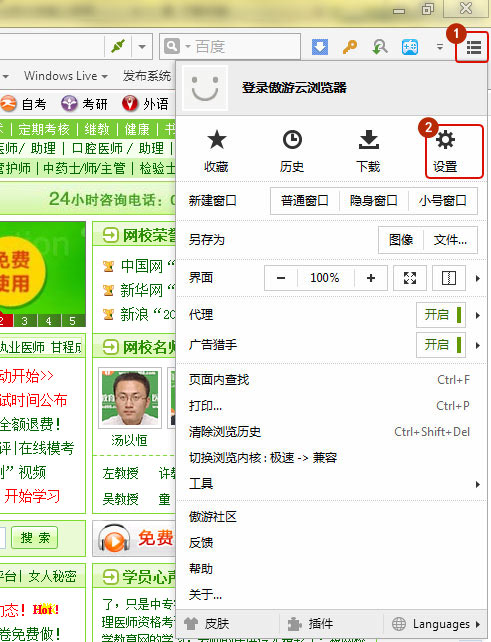 打開傲游瀏覽器-右上角列表按鈕-設(shè)置,如圖所示: