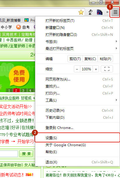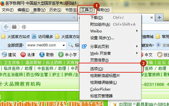 打開瀏覽器,先登錄到醫(yī)學(xué)教育網(wǎng)的頁面(這步很重要),點(diǎn)擊右上角小扳手-選項(xiàng),如圖所示:
