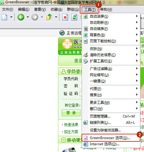 打開綠色瀏覽器-工具-GREENBROWSER選項(xiàng),如圖所示:
