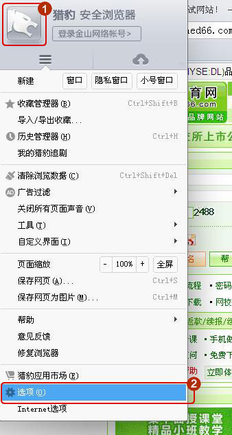 打開獵豹瀏覽器輸入并訪問 www.tymfj.cn后,點(diǎn)擊左上角豹頭>>選項(xiàng)。