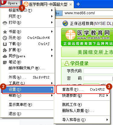打開opera瀏覽器-左上角菜單-設(shè)置-首選項(xiàng),如圖所示: