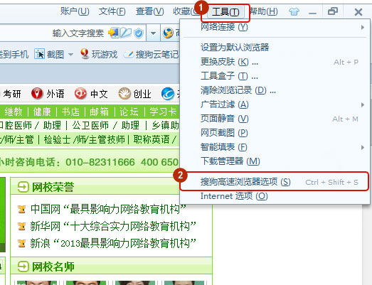 打開搜狗瀏覽器,點(diǎn)擊菜單里的工具 - 搜狗高速瀏覽器選項(xiàng),如圖所示: