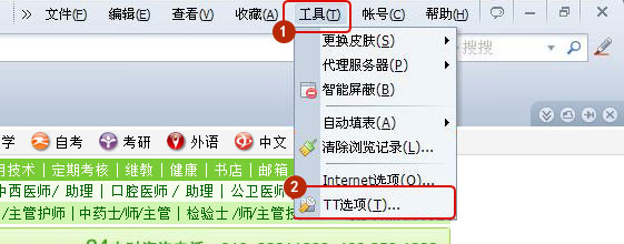 打開TT瀏覽器,選擇工具 - TT選項(xiàng),如圖所示: