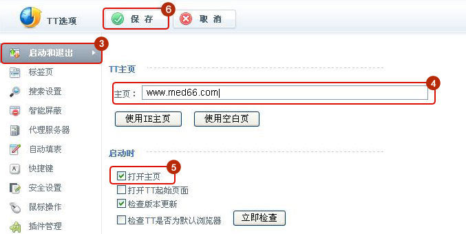 選擇啟動(dòng)和退出,輸入www.tymfj.cn為主頁,勾選啟動(dòng)時(shí)打開主頁。最后別忘了點(diǎn)擊保存按鈕。