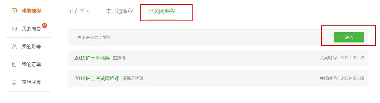 1、在“我的網(wǎng)校我的家”中,查看“已關(guān)閉課程”,點(diǎn)擊“進(jìn)入續(xù)學(xué)服務(wù)”;