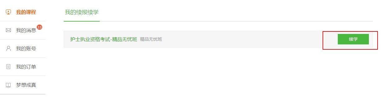 正值2019年護(hù)士、護(hù)師、主管護(hù)師成績查詢期間,購買過網(wǎng)校2019年護(hù)士、護(hù)師、主管護(hù)師精品無憂班的所有學(xué)員,在分?jǐn)?shù)線公布并確認(rèn)自己沒有通過考試后,可以在“我的家”續(xù)學(xué)入口申請續(xù)學(xué)。