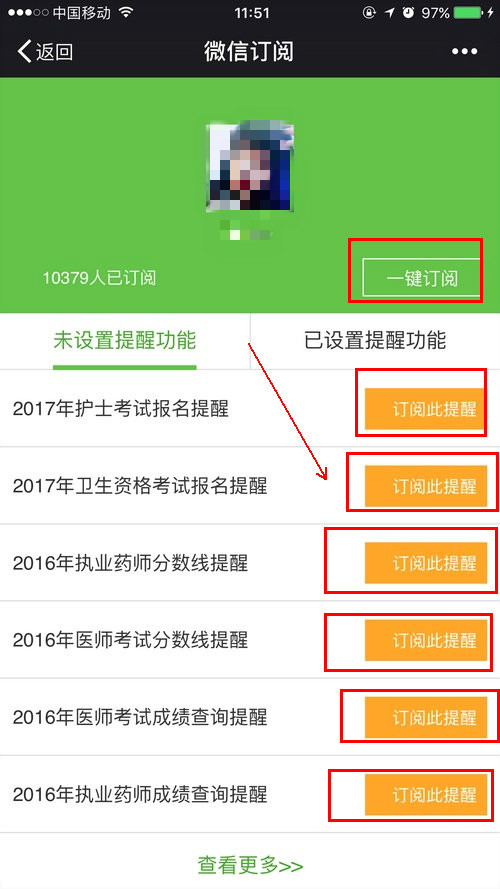 第六步:點擊:第五步圖片里的“閱讀全文”,進入微信訂閱頁面(如下圖所示),點擊您想訂閱的內(nèi)容,選擇訂閱后,一旦有該考試的相關(guān)信息,您的微信都將以最快得速度收到醫(yī)學教育網(wǎng)給您發(fā)的考試動態(tài)信息(當然您手機的是連接網(wǎng)絡狀態(tài)喲)