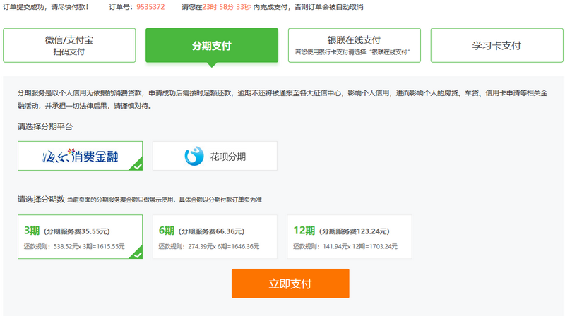 分期服務是以個人信用為依據(jù)的消費貸款,申請成功后需按時足額還款,逾期不還將被通報至各大征信中心,影響個人信用,進而影響個人的房貸、車貸、信用卡申請等相關金融活動,并承擔一切法律后果,請謹慎對待?;▎h分期詳情咨詢95188。