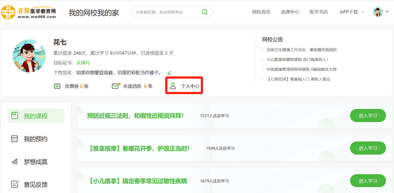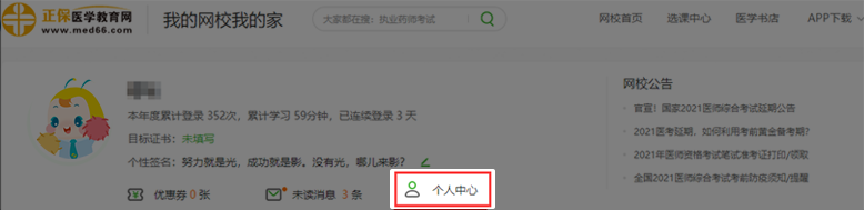 第一步:進(jìn)入我的網(wǎng)校我的家,點擊個人中心。