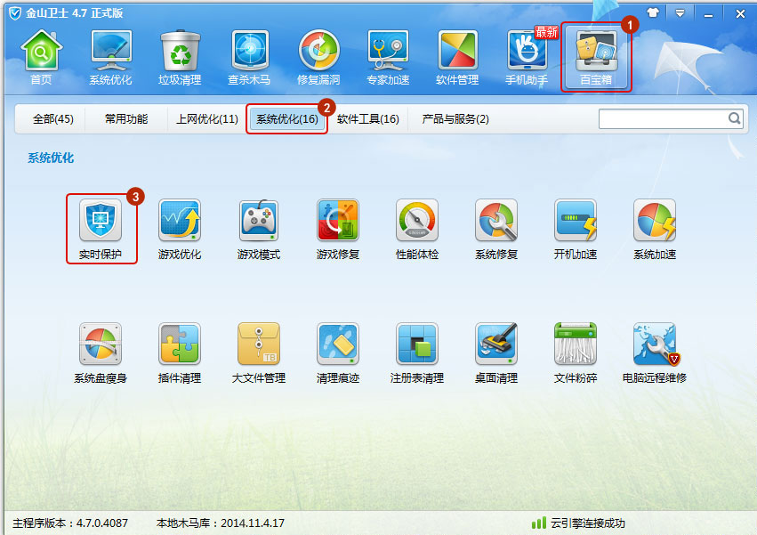 第一步:打開金山衛(wèi)士主界面,點(diǎn)擊“百寶箱”選項(xiàng)卡,選擇“系統(tǒng)優(yōu)化”,點(diǎn)擊“實(shí)時(shí)保護(hù)”。