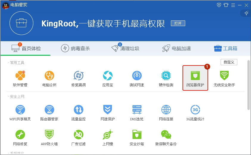 第一步:打開QQ電腦管家首頁,點(diǎn)擊“工具箱”中的“瀏覽器保護(hù)”。