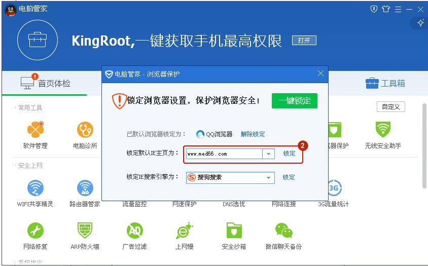 第二步:選擇默認(rèn)瀏覽器后,在下方默認(rèn)主頁輸入框內(nèi)輸入“www.tymfj.cn”,點(diǎn)擊“一鍵鎖定”即可。