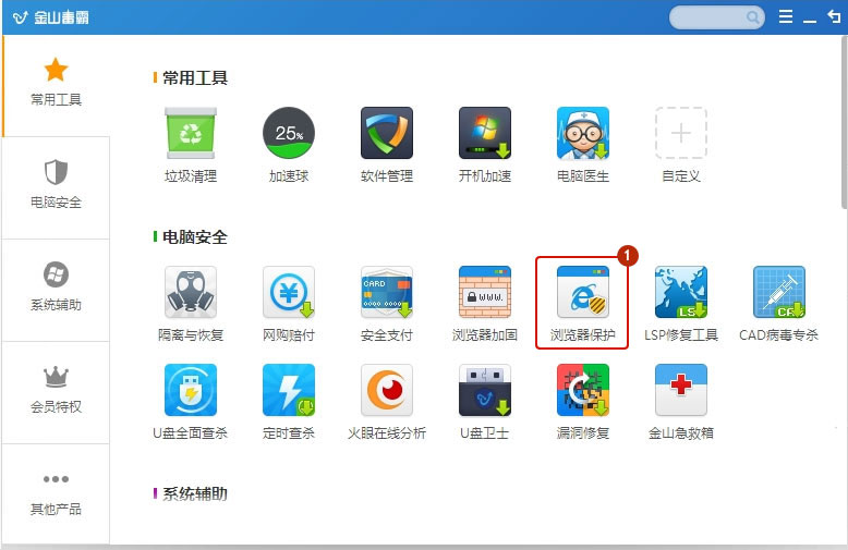 第一步:打開金山毒霸首頁后,點(diǎn)擊常用工具-瀏覽器保護(hù)。