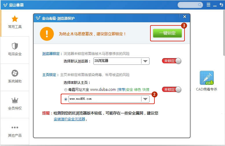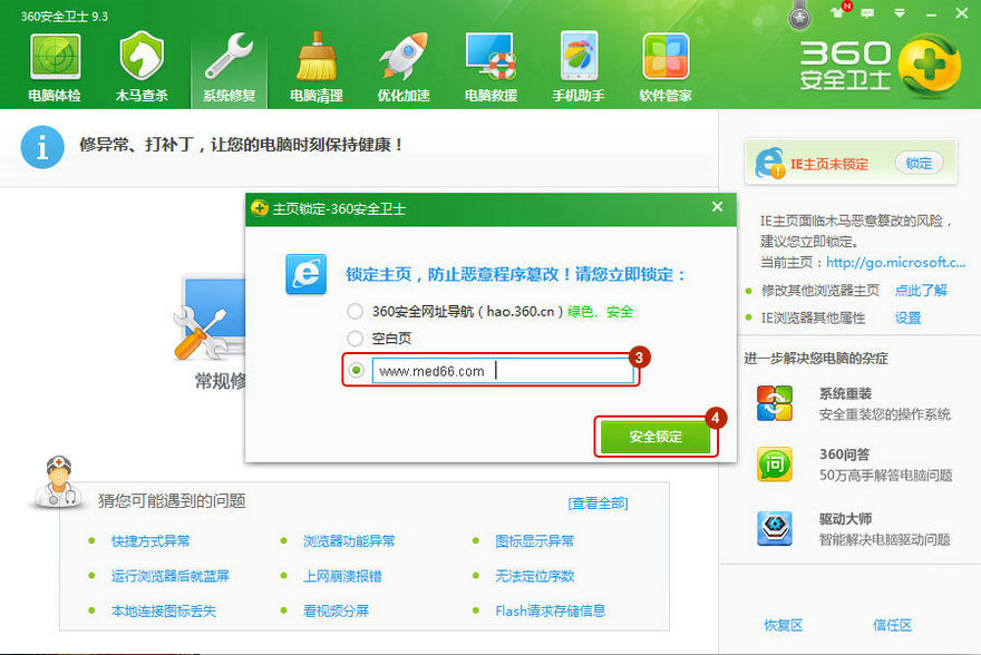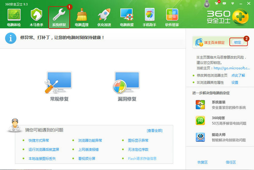 第一步:打開360安全衛(wèi)士-系統(tǒng)修復(fù)-IE常規(guī)的“鎖定”。