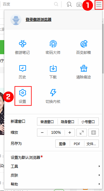 第一步:打開傲游瀏覽器-右上角列表按鈕-設(shè)置,如圖所示: