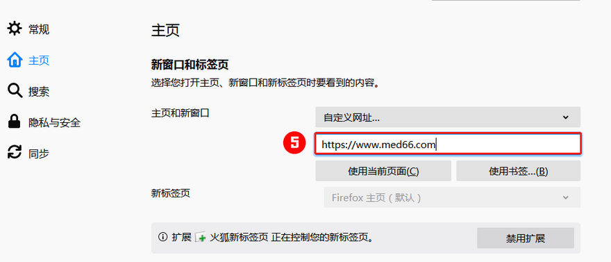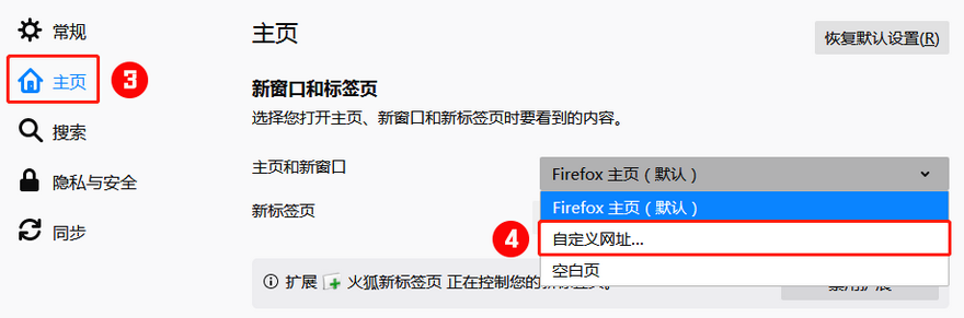 第二步:進(jìn)入"主頁"選項(xiàng),點(diǎn)擊“Firefox主頁(默認(rèn))”后,選擇“自定義網(wǎng)址”。