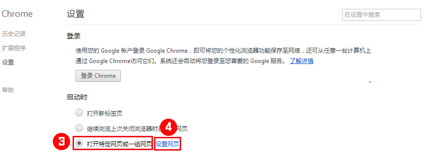 第二步:在啟動(dòng)時(shí),點(diǎn)擊“打開特定網(wǎng)頁或一組網(wǎng)頁”后,點(diǎn)擊“設(shè)置網(wǎng)頁”。