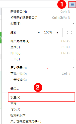 第一步:打開世界之窗瀏覽器,然后點(diǎn)擊右上角列表按鈕-設(shè)置,如圖所示: