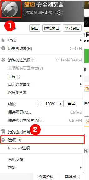 第一步:打開獵豹瀏覽器輸入并訪問 www.tymfj.cn后,點(diǎn)擊左上角豹頭>>選項(xiàng)。