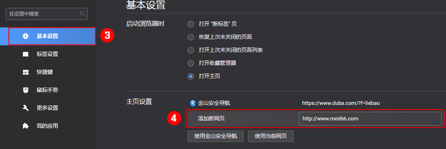 第二步:基本設(shè)置-主頁設(shè)增加新網(wǎng)頁,輸入http://www.tymfj.cn即可。