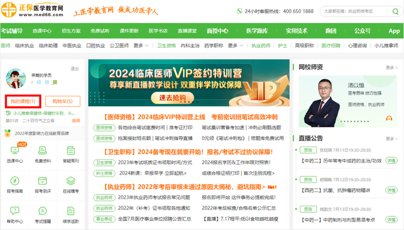 第一步:使用電腦打開(kāi)正保醫(yī)學(xué)教育網(wǎng)官網(wǎng)(www.tymfj.cn),登錄賬號(hào)后點(diǎn)擊“我的課程”。
