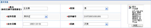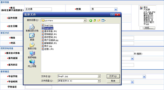 讀入照片時(shí),要求所選擇的圖片只能是gif,jpg,png格式之一,大小在160*210像素內(nèi),且文件不能大于30k.點(diǎn)擊頁(yè)面右上角圖片下的“瀏覽”,出現(xiàn)選擇照片存儲(chǔ)路徑頁(yè)面,如圖(3-3)。