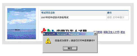 考生填寫完全部的信息后,請(qǐng)點(diǎn)擊右下角“保存”將考生信息提交到中心服務(wù)器。信息保存成功,會(huì)自動(dòng)彈出“信息成功保存,請(qǐng)進(jìn)行打印申報(bào)表操作”對(duì)話框,并進(jìn)入打印申報(bào)表的界面,如圖(3-18)。