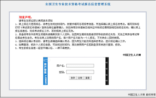 1、 考生必須注冊(cè)用戶名后方可登錄報(bào)名系統(tǒng),進(jìn)行全國(guó)衛(wèi)生資格考試的報(bào)名工作。