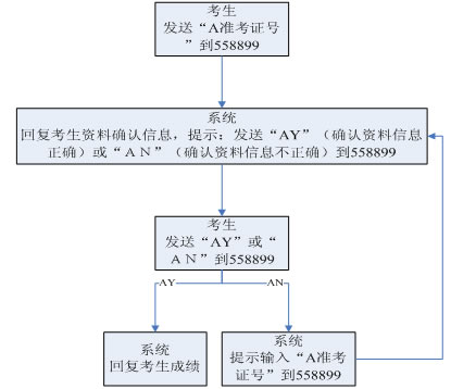 考生發(fā)送“A準(zhǔn)考證號(hào)”到 558899 系統(tǒng)回復(fù)考生資料確認(rèn)信息,并提示:發(fā)送“AY”(確認(rèn)資料信息正確)或“AN”(確認(rèn)資料信息不正確)到 558899 考生發(fā)送“AY”或“AN”到 558899 系統(tǒng)回復(fù)考生成績(jī),或提示輸入“A準(zhǔn)考證號(hào)”到 558899。
