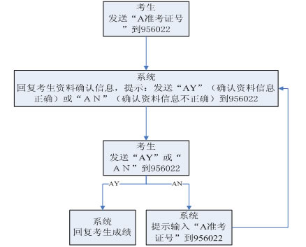考生發(fā)送“A準(zhǔn)考證號(hào)”到 956022 系統(tǒng)回復(fù)考生資料確認(rèn)信息,并提示:發(fā)送“AY”(確認(rèn)資料信息正確)或“AN”(確認(rèn)資料信息不正確)到 956022 考生發(fā)送“AY”或“AN”到 956022 系統(tǒng)回復(fù)考生成績(jī),或提示輸入“A準(zhǔn)考證號(hào)”到 956022。