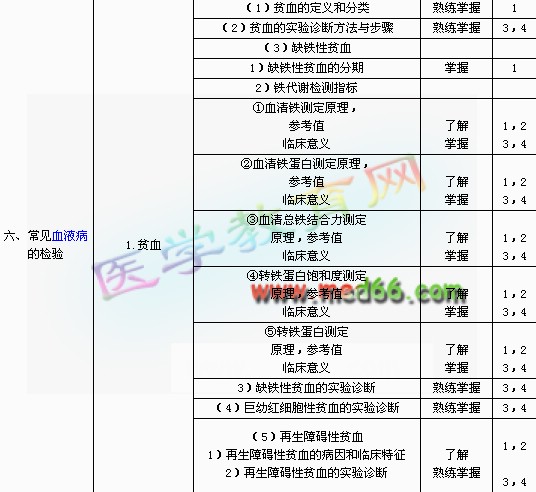 | 三、骨髓細(xì)胞學(xué)檢查的臨床意義 | 1.骨髓檢查的內(nèi)容與方法 | (1)骨髓檢查的主要臨床應(yīng)用 | 掌握 | 1,4 |