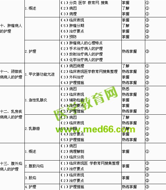| 4.大腸癌 | (1)病因病理 (2)臨床表現(xiàn) (3)輔助檢查 (4)治療要點醫(yī)學(xué) 教育網(wǎng)搜集整理 (5)護理措施 | 了解 掌握 熟練掌握 掌握 熟練掌握 | ① ③ ② ② ③ | |