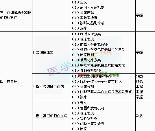 | 4.再生障礙性貧血 | (1)分型 (2)病因和發(fā)病機(jī)制 (3)急性再障和慢性再障的臨床表現(xiàn)及實(shí)驗(yàn)室檢查 (4)診斷與鑒別診斷 (5)治療 | 掌握 | |