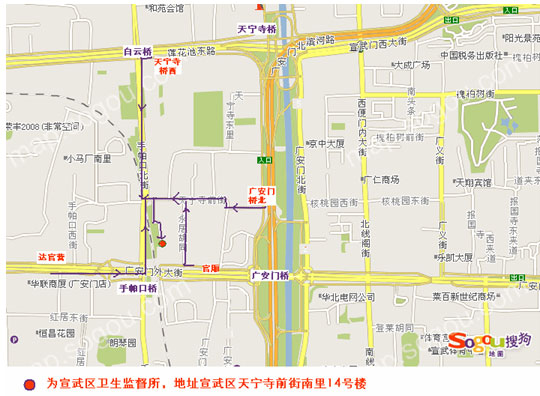 宣武區(qū)衛(wèi)生監(jiān)督所位于白云橋南、手帕口橋北100米,天寧寺鐵道口東側(cè),可按照“衛(wèi)生監(jiān)督所”的指示牌往南行穿過(guò)花園即是。