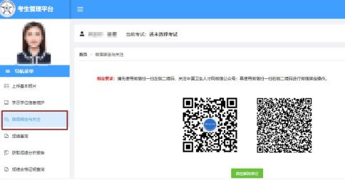 考生綁定微信后方可選擇考試項(xiàng)目進(jìn)行報(bào)名。點(diǎn)擊左側(cè)導(dǎo)航菜單中“微信綁定與關(guān)注”。