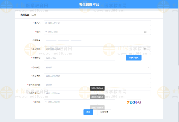 1、務(wù)必由考生本人進行注冊操作,確保信息真實有效。點擊“注冊”后信息將無法自行修改,請認真核對填寫內(nèi)容。