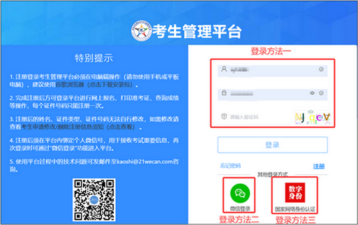 考生報名前須完成考生管理平臺注冊和基本信息填報,具體流程詳見《考生管理平臺注冊須知》(點擊查看)。完成后,方可登錄考生管理平臺進行考試報名。