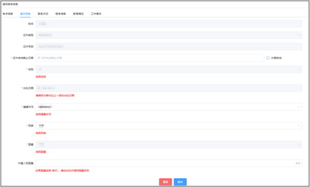 (2)基本信息會根據(jù)考生注冊時填寫的內(nèi)容自動引用,如未引用性別、出生日期,考生可手動選擇,民族和健康狀態(tài)諸根據(jù)實際情況下拉選擇。
