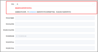 如引用的學歷信息有誤,請按照頁面提示(如下圖所示),在“學歷學位信息維護”頁面添加正確的學歷信息后,再重新引用。
