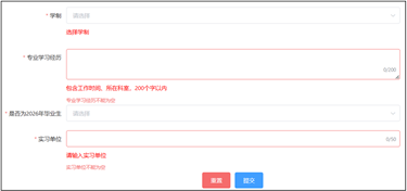 依次填寫“學制”“專業(yè)學習經(jīng)歷”“是否為2026年畢業(yè)生”、“實習單位”。
