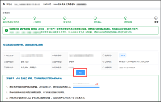 點擊報考流程中的【繳襲】節(jié)點,核對報考專業(yè)、科目和金額,確認無誤后點擊“支付”按鈕,頁面跳轉(zhuǎn)至考區(qū)指定的繳費平臺進行支付。完成繳費后【繳費】節(jié)點變?yōu)榫G色,表示報名成功。