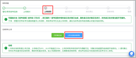 填寫信息完成后,系統(tǒng)將跳轉(zhuǎn)至【上傳材料】節(jié)點,進入上傳材料頁面。考生可先點擊“查看報名表”,下載并打印報名申請表,然后按照考區(qū)的要求上傳相關(guān)證明材料。