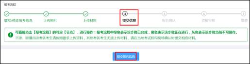 材料上傳完成后系統(tǒng)將跳轉(zhuǎn)至【提交信息】頁,考生也可點擊報考流程中的【提交信息】節(jié)點,確認無誤后點擊“提交報名信息”。